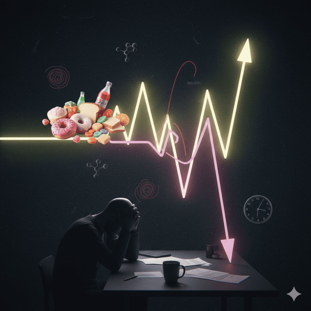 Cuando consumes carbohidratos (especialmente los refinados), se descomponen rápidamente en glucosa, provocando un «pico» en sangre. Tu páncreas responde liberando insulina para llevar esa glucosa a las células. Si este proceso es demasiado brusco, se genera un «bajón» o hipoglucemia reactiva, con sus típicos síntomas: fatiga, ansiedad por comer más dulce, niebla mental e irritabilidad.